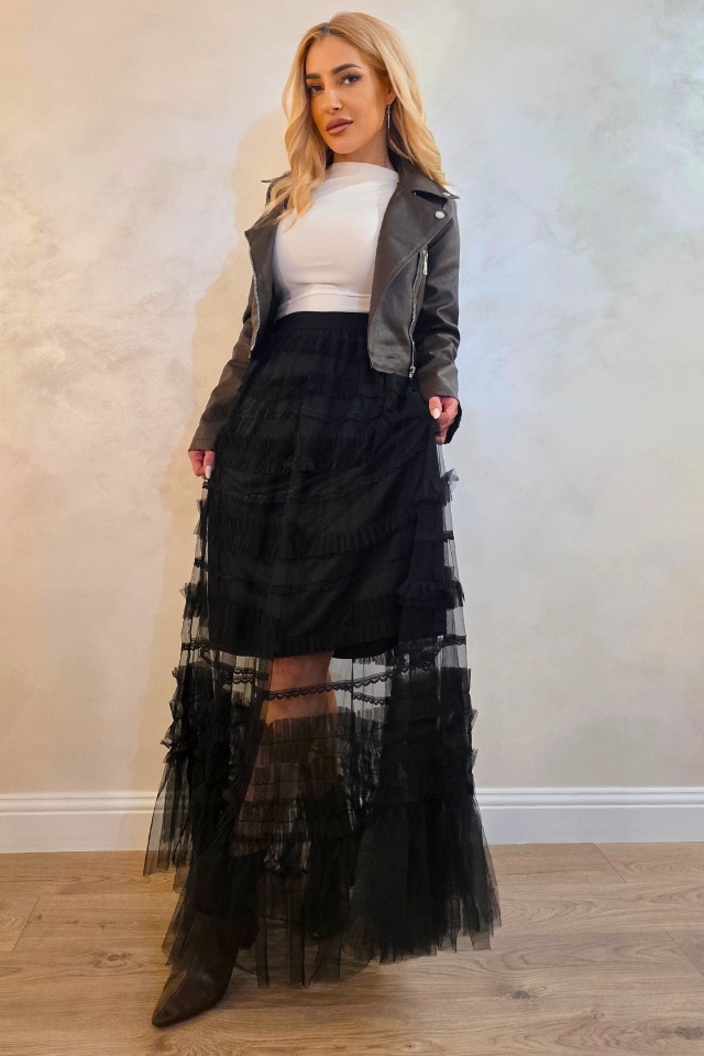 Fusta lunga BOHO, transparenta, cu insertii de tull si dantela, NEGRU
