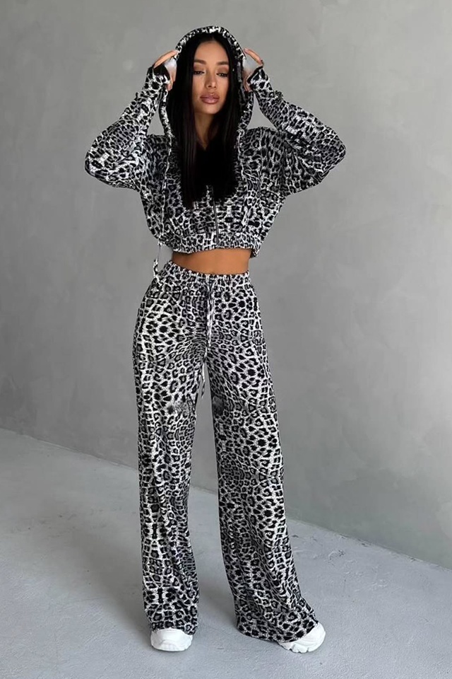Compleu casual de dama, Savage, pantaloni largi si hanorac cu fermoar, BEJ Leopard