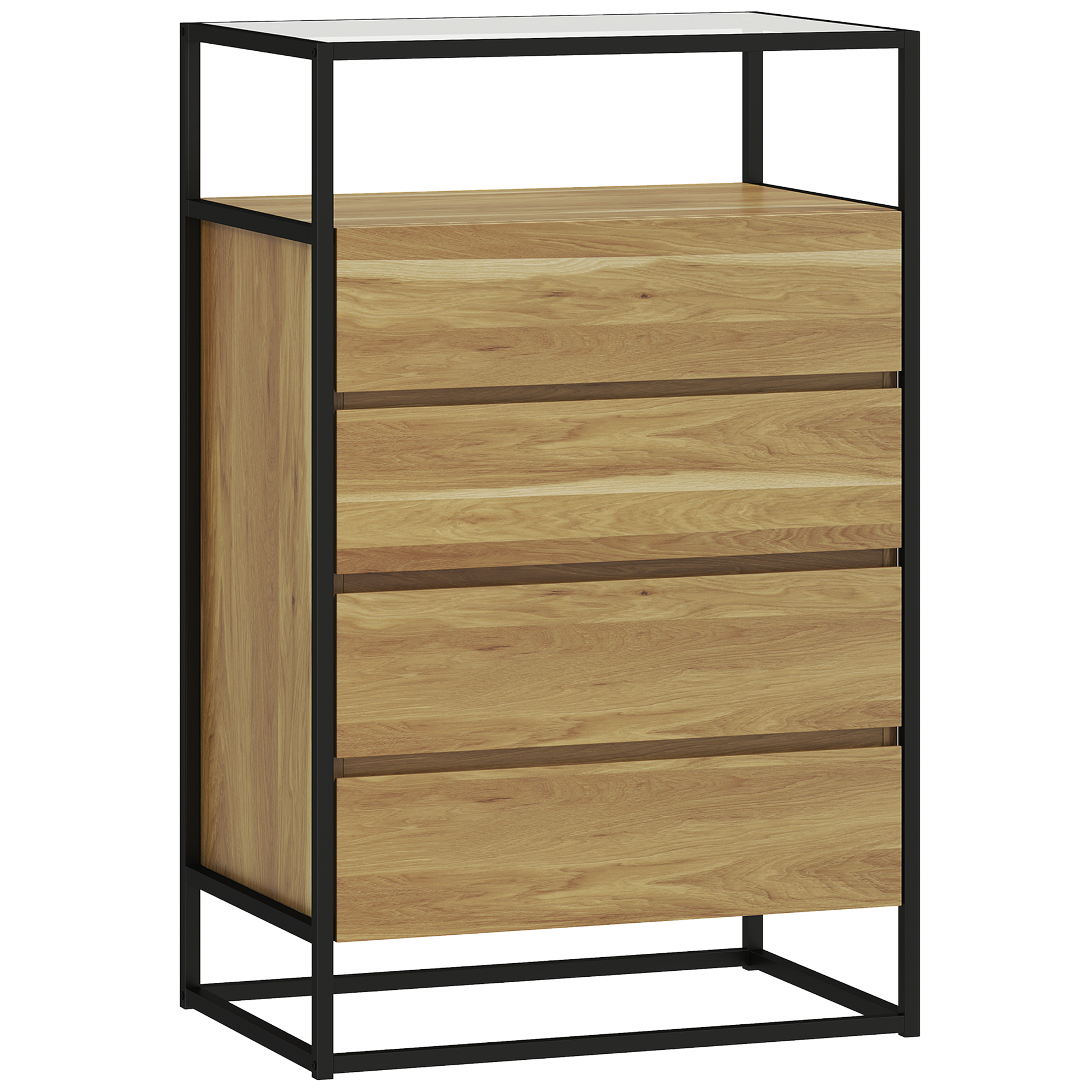 HOMCOM Comodă cu 4 Sertare, Raft Deschis, Oțel, Sticlă Securizată | Aosom Romania
