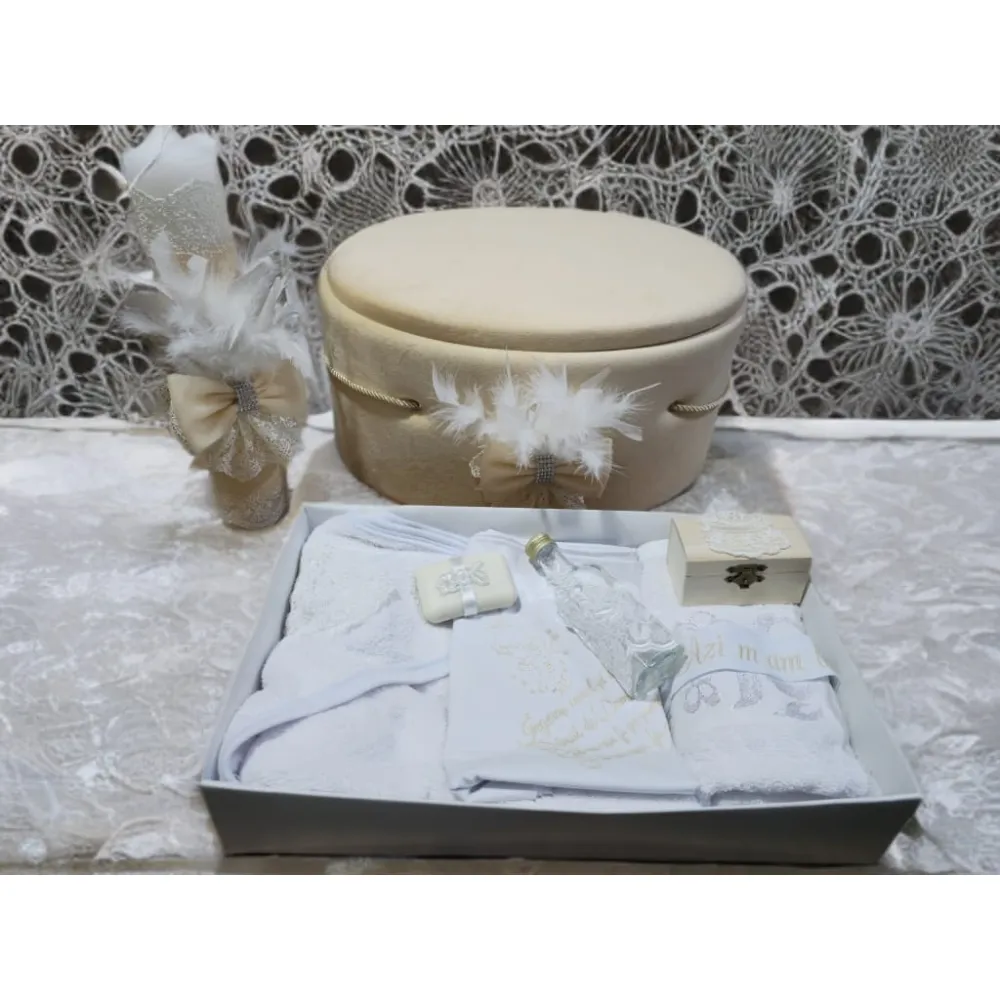 Trusou Botez cu 7 Piese + Cutie Catifea + Lumanare - Bej - TB912