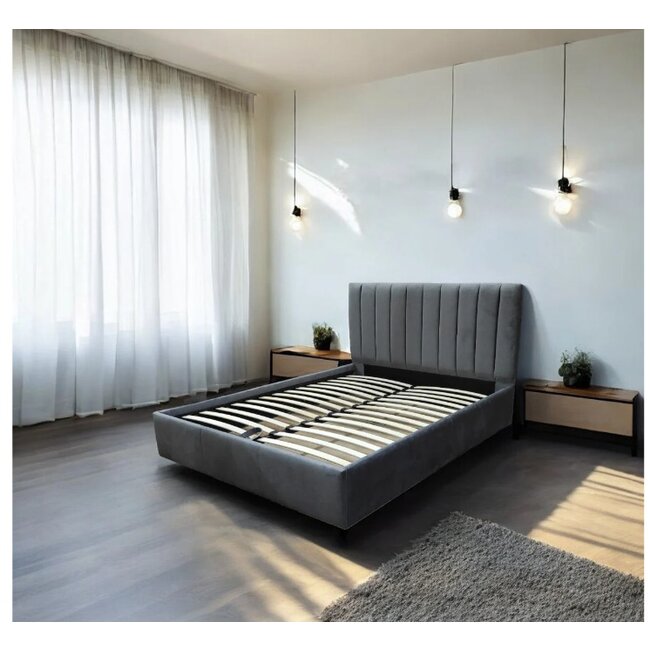 Pat Nisa, tăblie capitonată, ladă depozitare, tapițerie stofă premium, 140x200 cm, Gri Închis