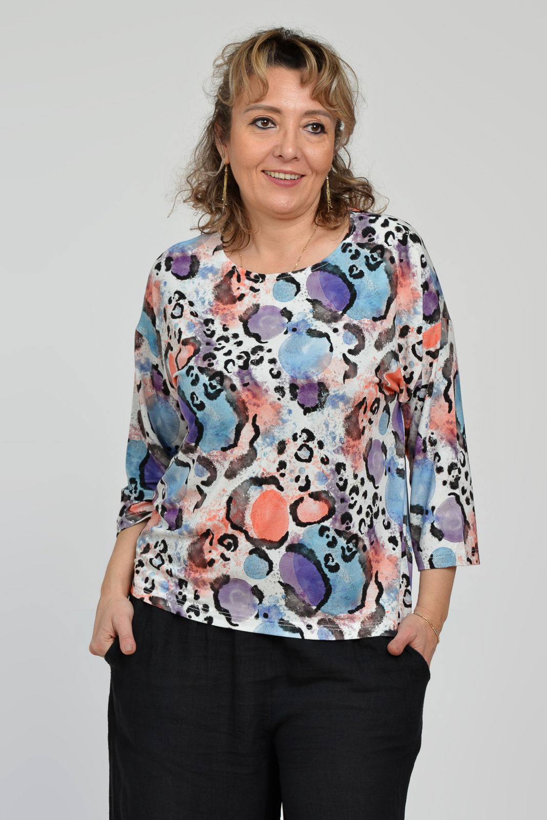 Bluza casual, imprimeu mov, albastru si corai pe fond alb si maneca 3 4 S/M