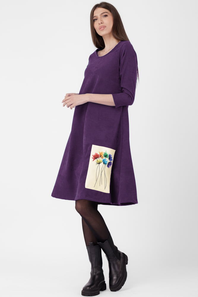 Rochie A line , din material catifelat, mov inchis, cu aplicatie color S/M