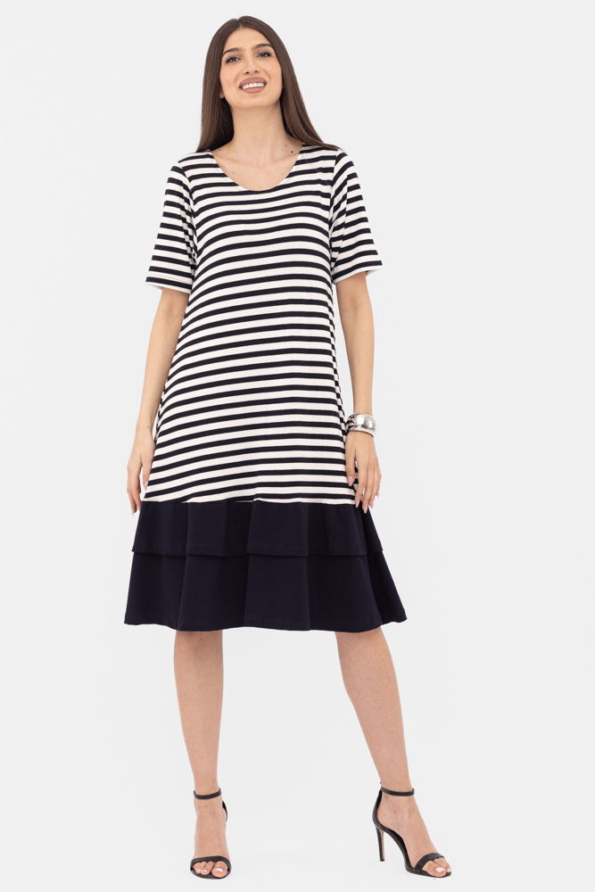 Rochie A line midi, din vascoza, cu imprimeu dungi alb-bleumarin si volan uni la poale S/M