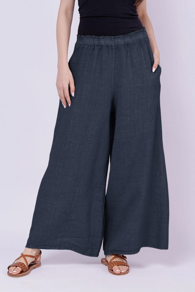 Pantaloni de vara din in largi, bleumarin Talie unica