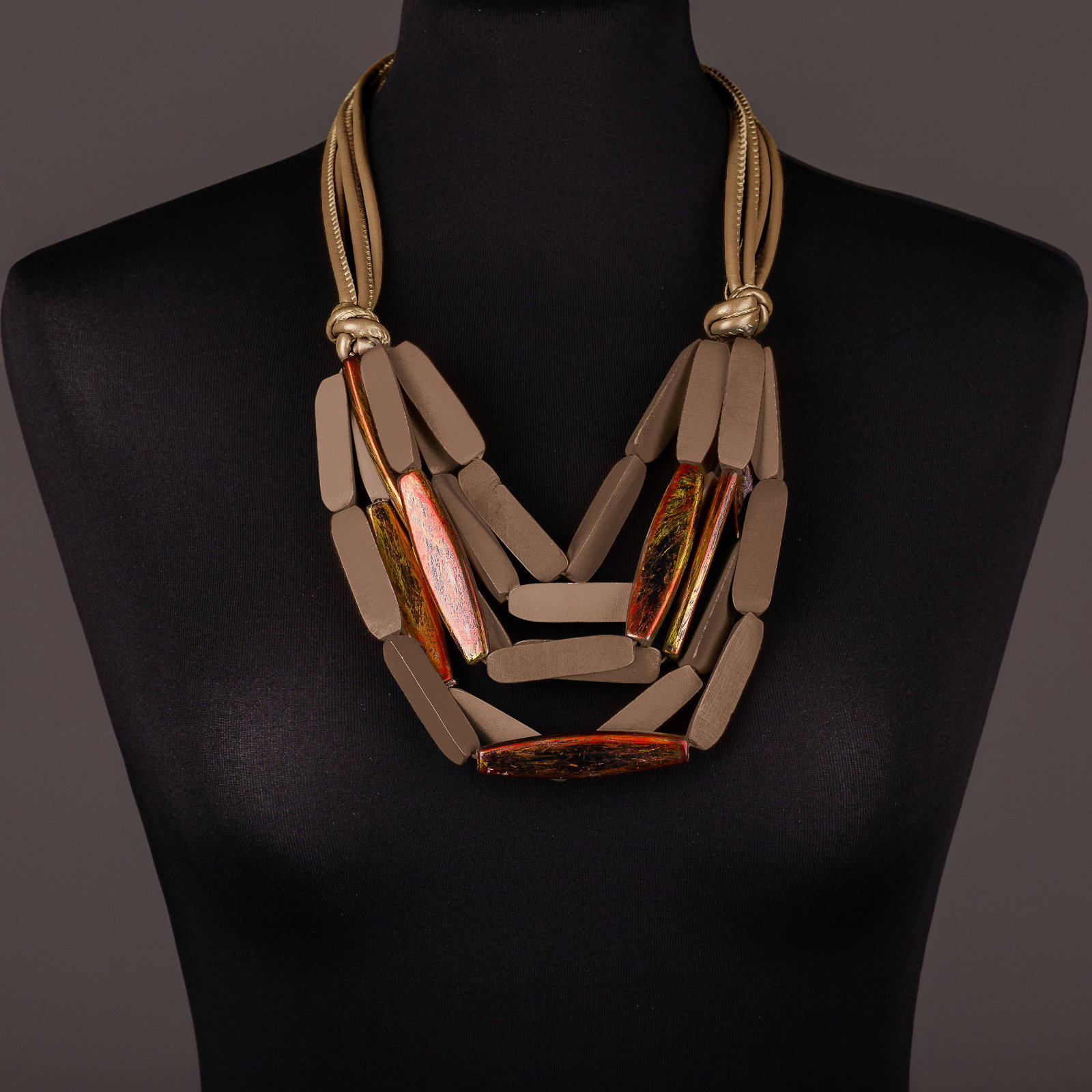 Colier cu multe siruri si floare pandant, in nuante de bej si camel