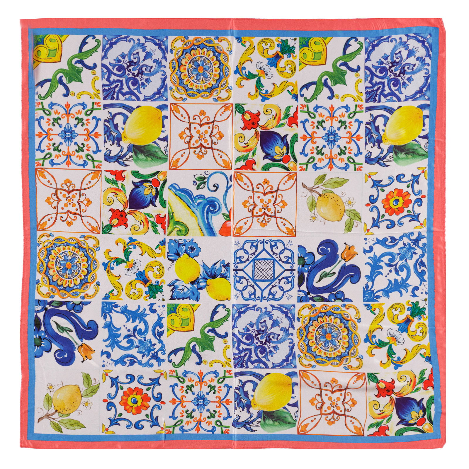 Esarfa patrata cu o singura fata, imprimeu marocan cu albastru, galben si corai