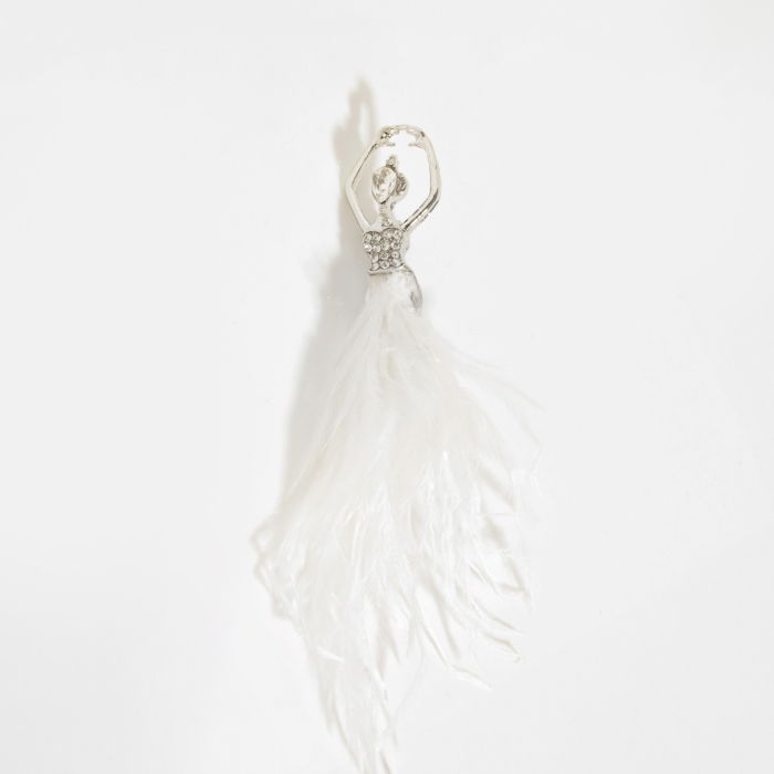 Brosa metalica argintie balerina cu pietricele argintii si rochita din pene albe si fine