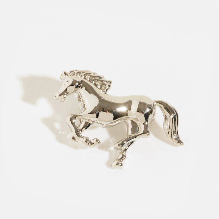 Brosa metalica argintie calut - anul Calului, ce simbolizeaza libertatea, independenta, faima si succesul