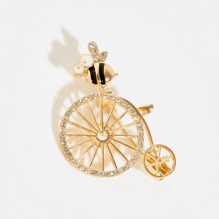 Brosa metalica aurie - albinuta pe bicicleta cu pietrcele mici argintii