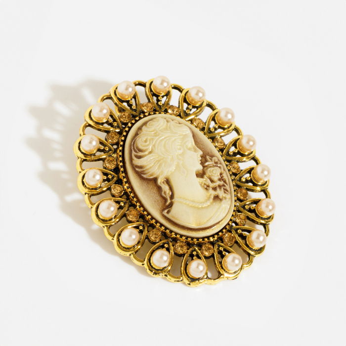 Brosa metalica aurie, ovala - camee cu perle si pietricele fine aurii