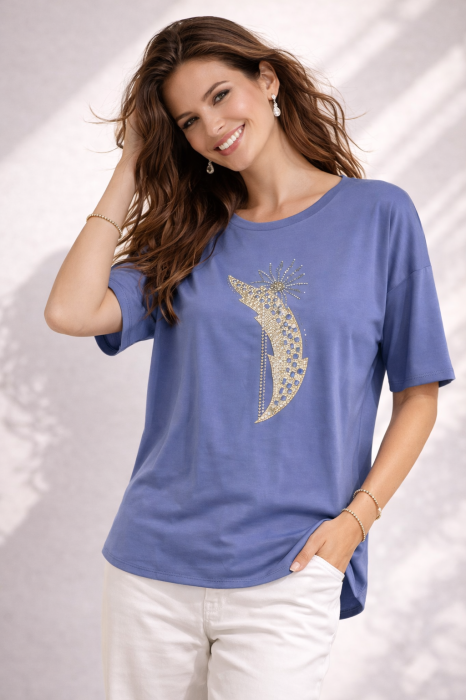 Bluza dama albastra cu imprimeu pietricele si nasturi decorativi in spate