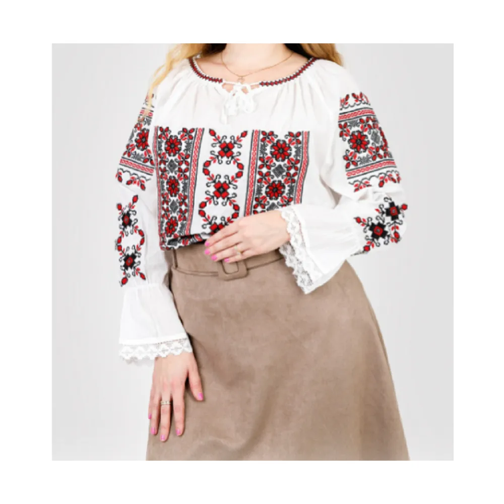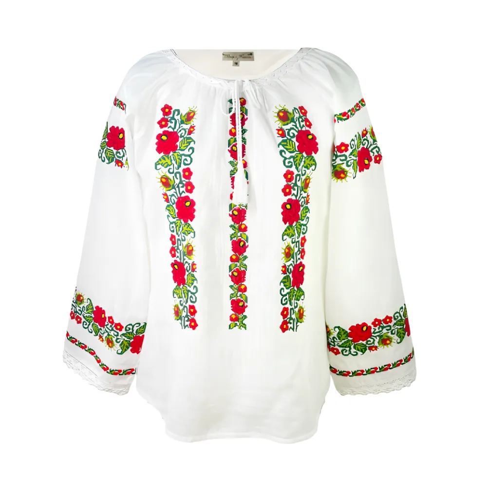 Bluza Tip Ie Alba cu Motiv Floral Rosu - BMG49
