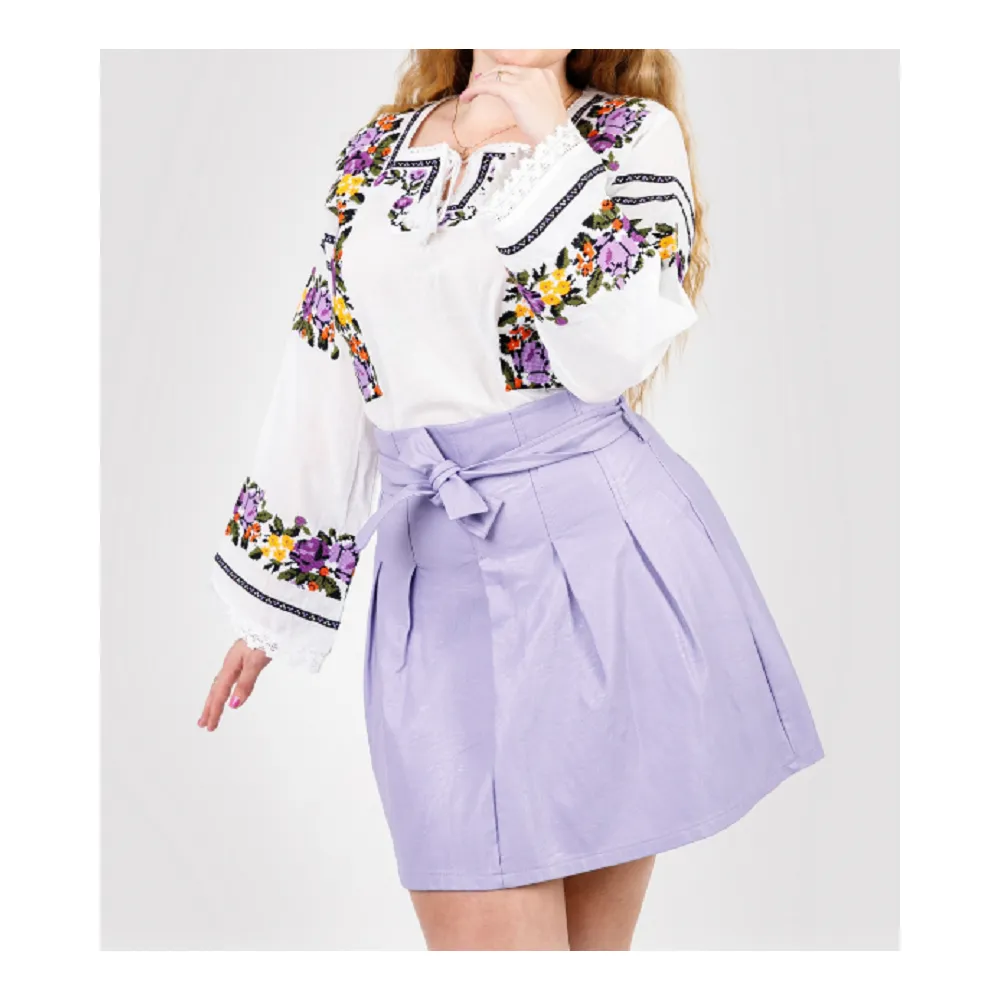 Ie Traditionala Alba cu Motiv Floral mov de Dama - IMS29