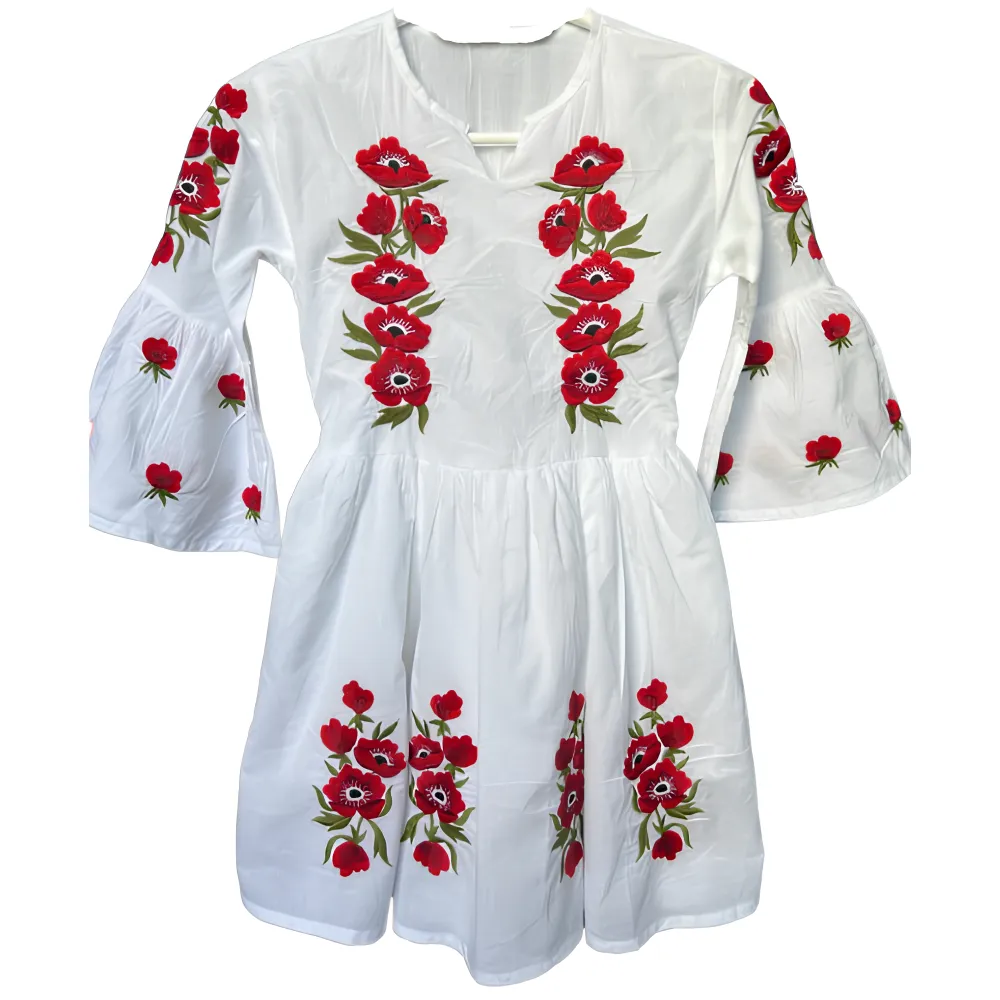 Rochie Traditionala Alba pentru Fetite cu Motiv Floral Rosu- RTF11