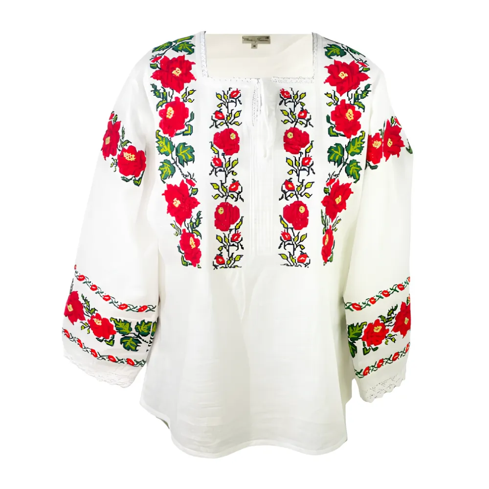 Bluza Tip Ie Alba cu Motiv Floral Rosu - BMG27