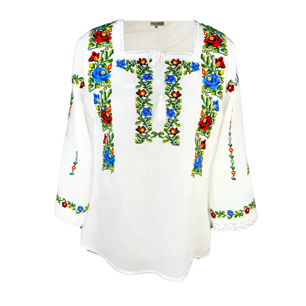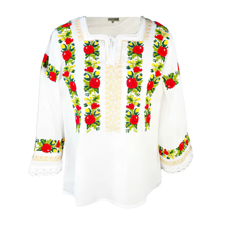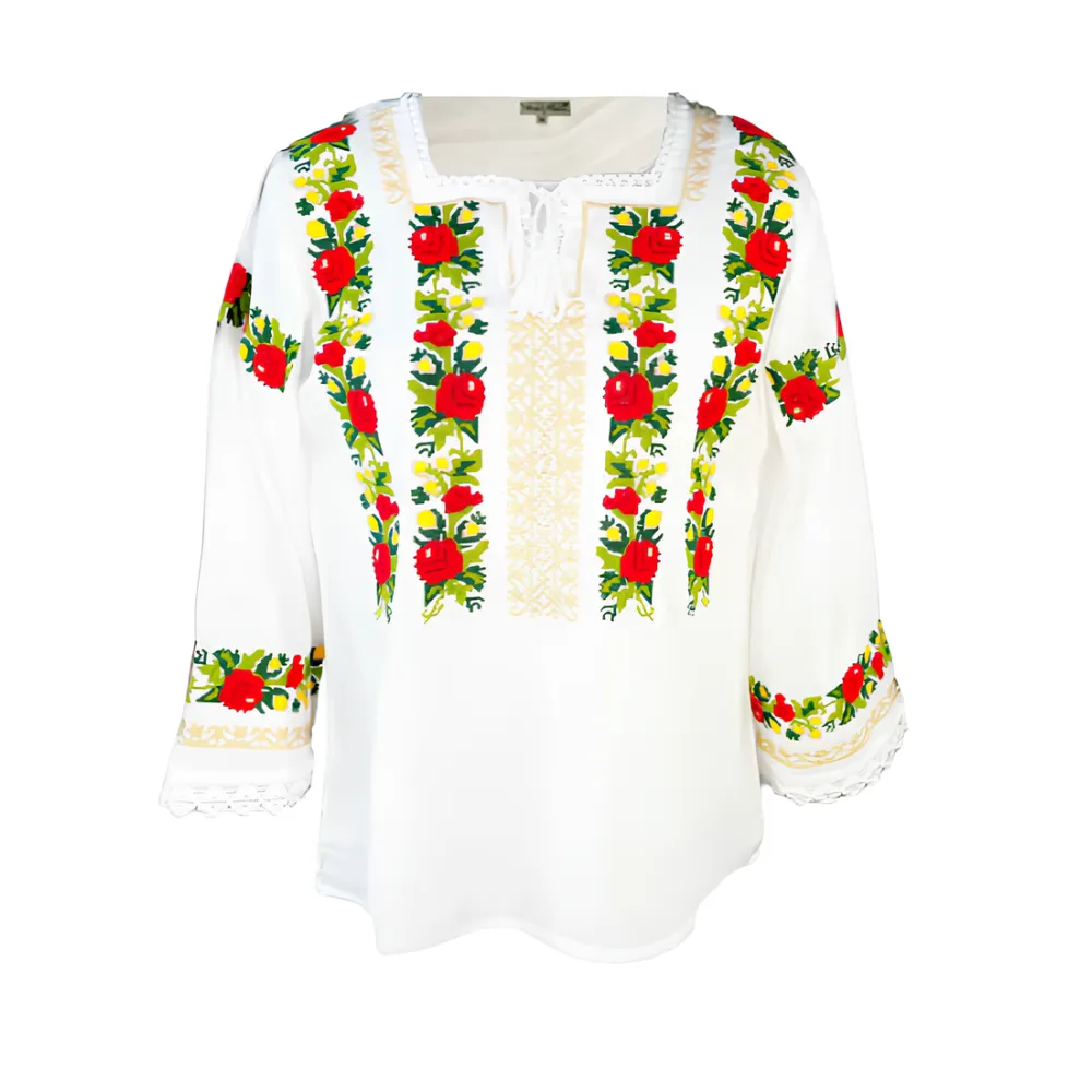 Ie Traditionala Alba cu Motiv Floral Multicolor de Dama - IMS30