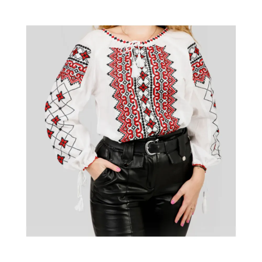 Ie Traditionala Alba cu Motiv Geometric Rosu- IML11