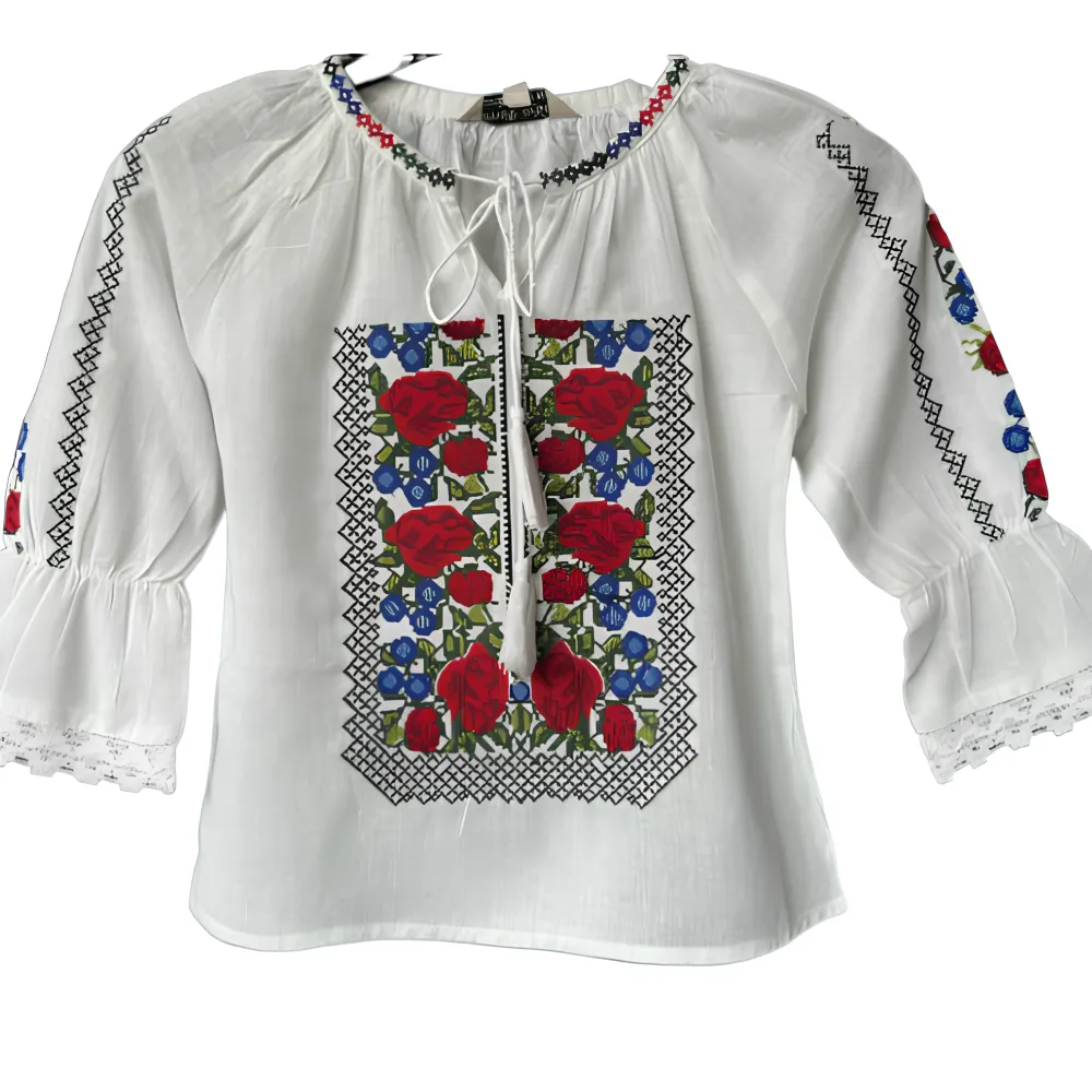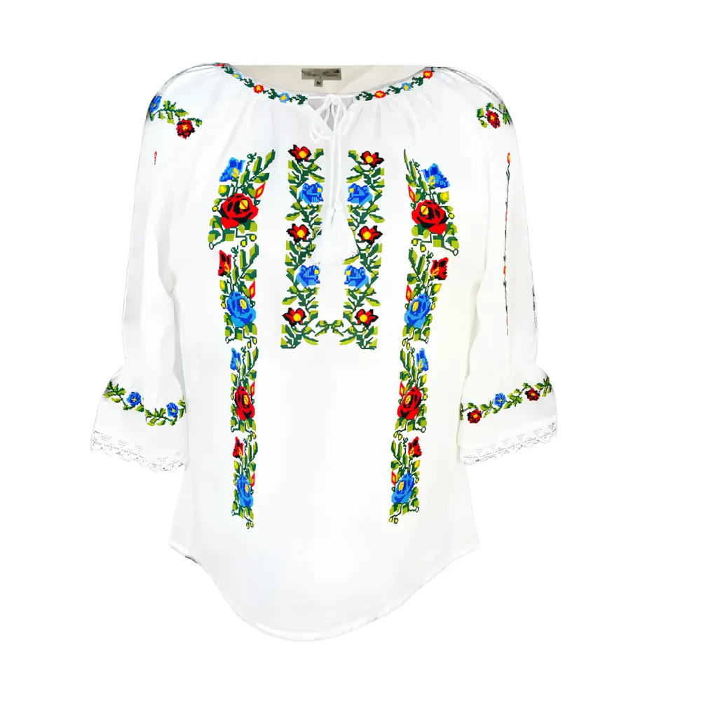 Ie Traditionala Alba cu Motiv Floral Rosu -IML12