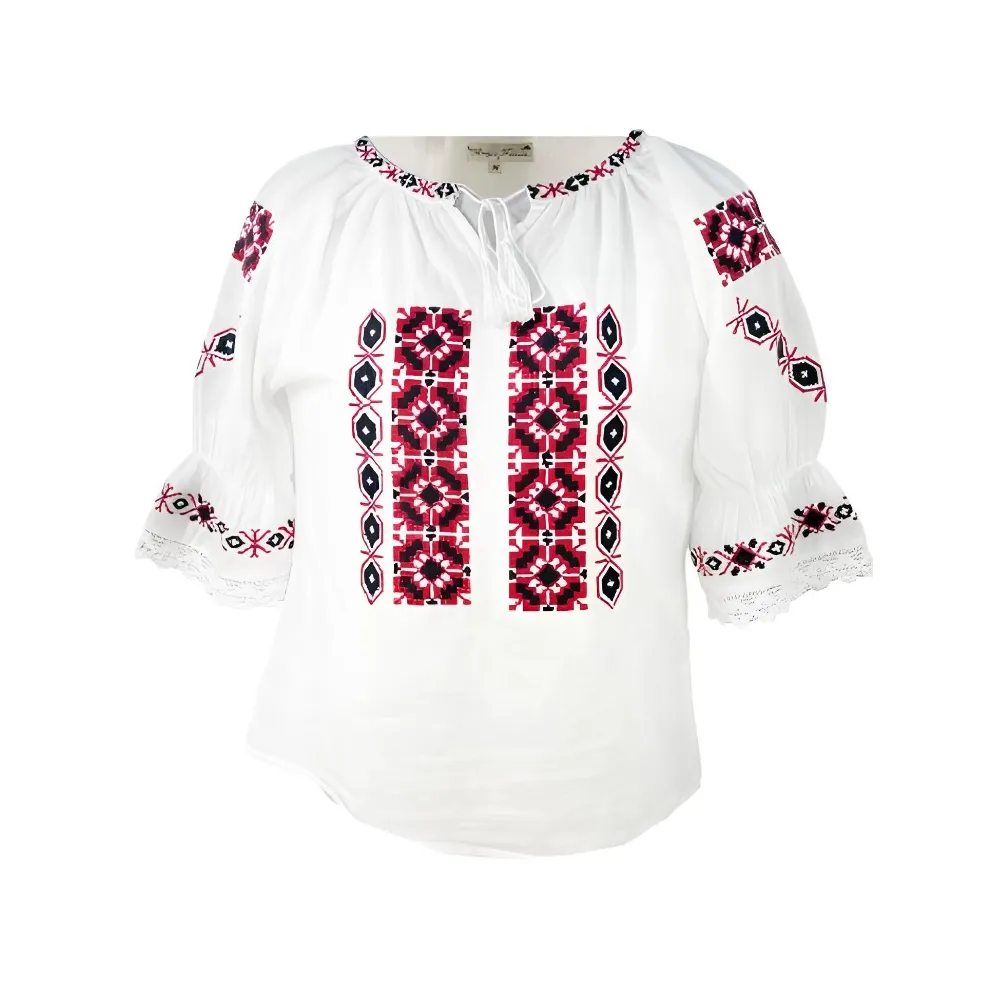 Ie Traditionala Alba pentru Fetite cu Motiv Geometric Rosu - ITF06