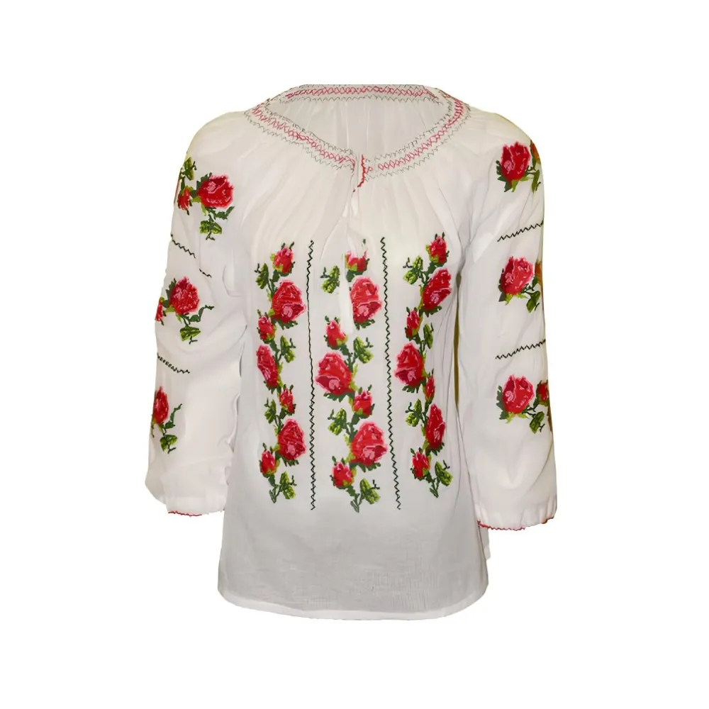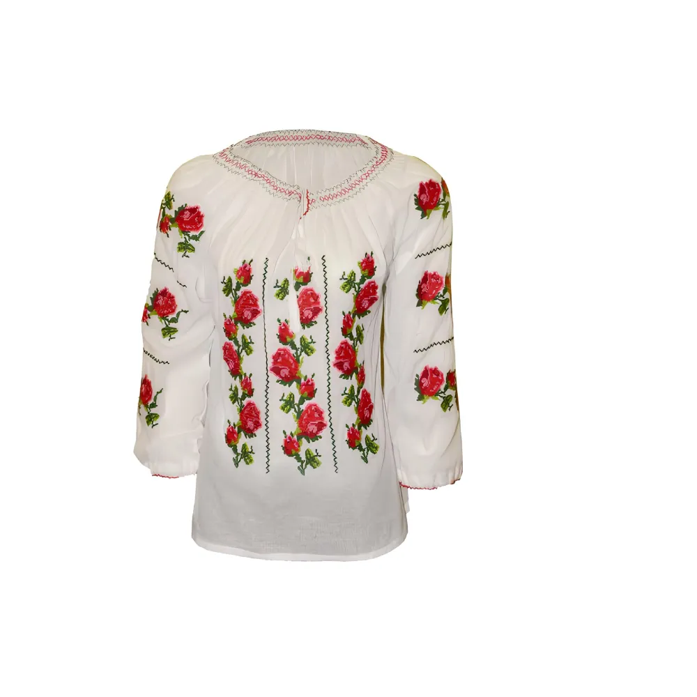 Ie traditionala alba pentru fetite cu motiv floral rosu - ITF04