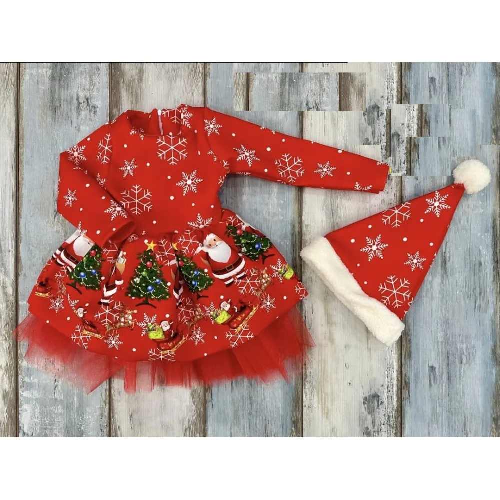 Rochita Rosie de Craciun cu perle si Caciulita - NNK113
