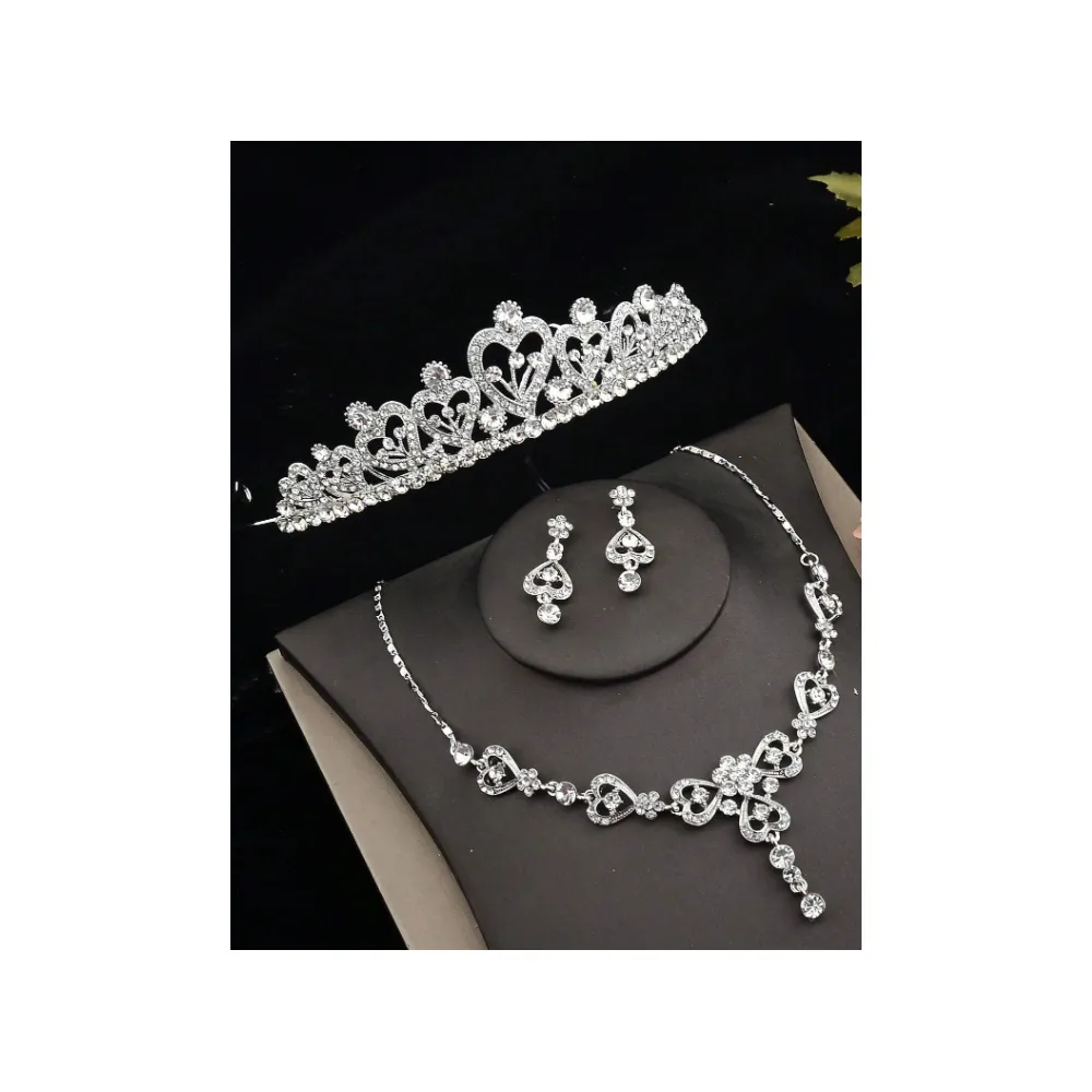 Set Diadema (Coronita) Mireasa Model cu Pietre si Strasuri, Colier si Cercei - Argintii - Circumferinta 37 cm