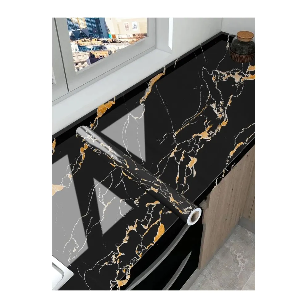 Autocolant Bucatarie Rola-Sticker Impermeabil,Efect Marmura,Negru cu Auriu,300x45cm-44776