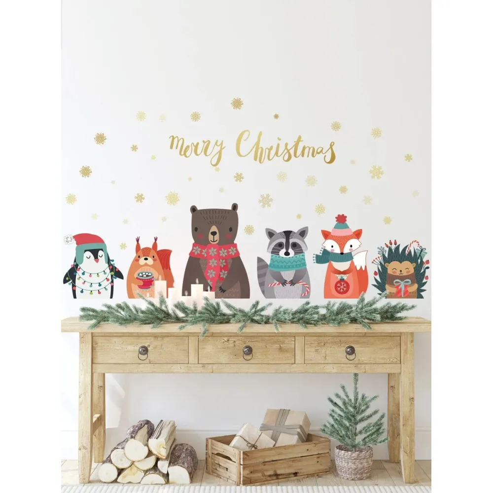 Sticker Perete Autocolant de Craciun Animalute Dragute Imbracate de Iarna 90x50cm