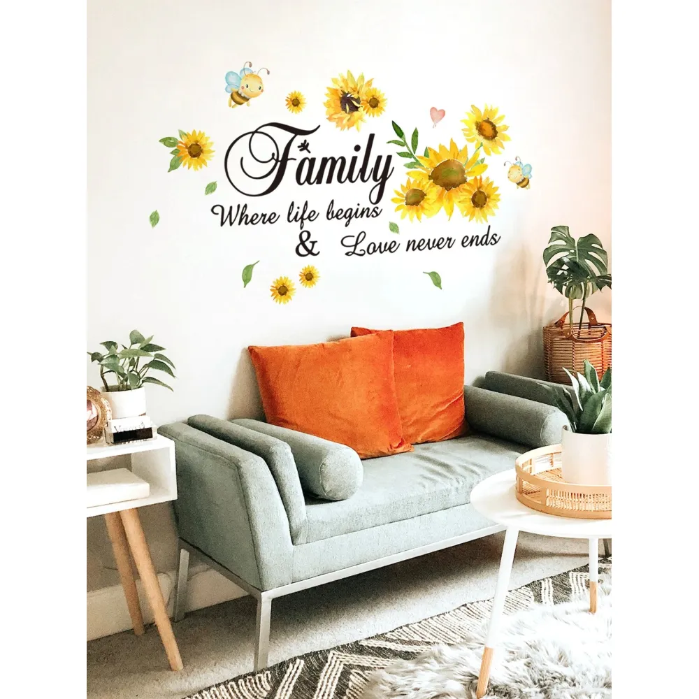 Sticker Perete Autocolant Flori de Floarea Soarelui si Mesaj Familie 68x43cm