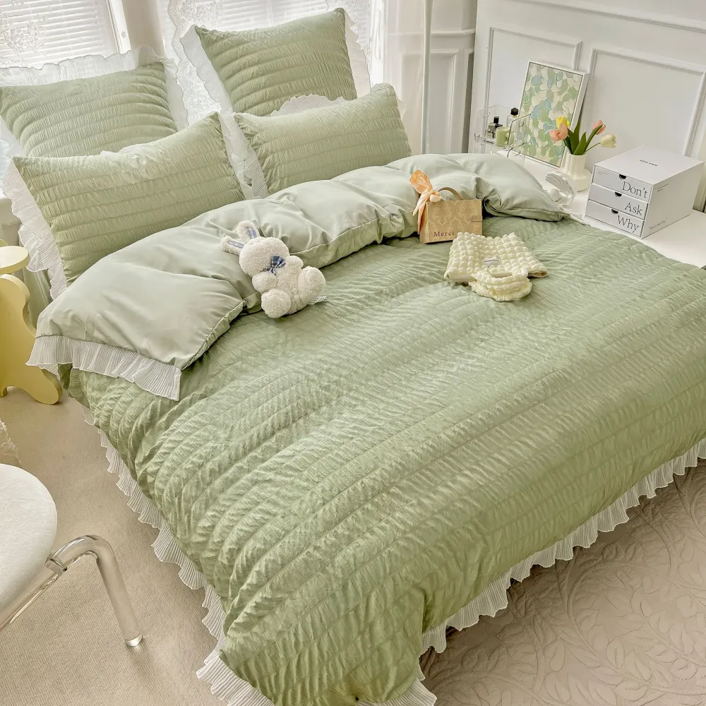 Lenjerie de Pat Dublu, Bumbac Finet-Creponat cu Margine, 6 Piese, Verde- JO311