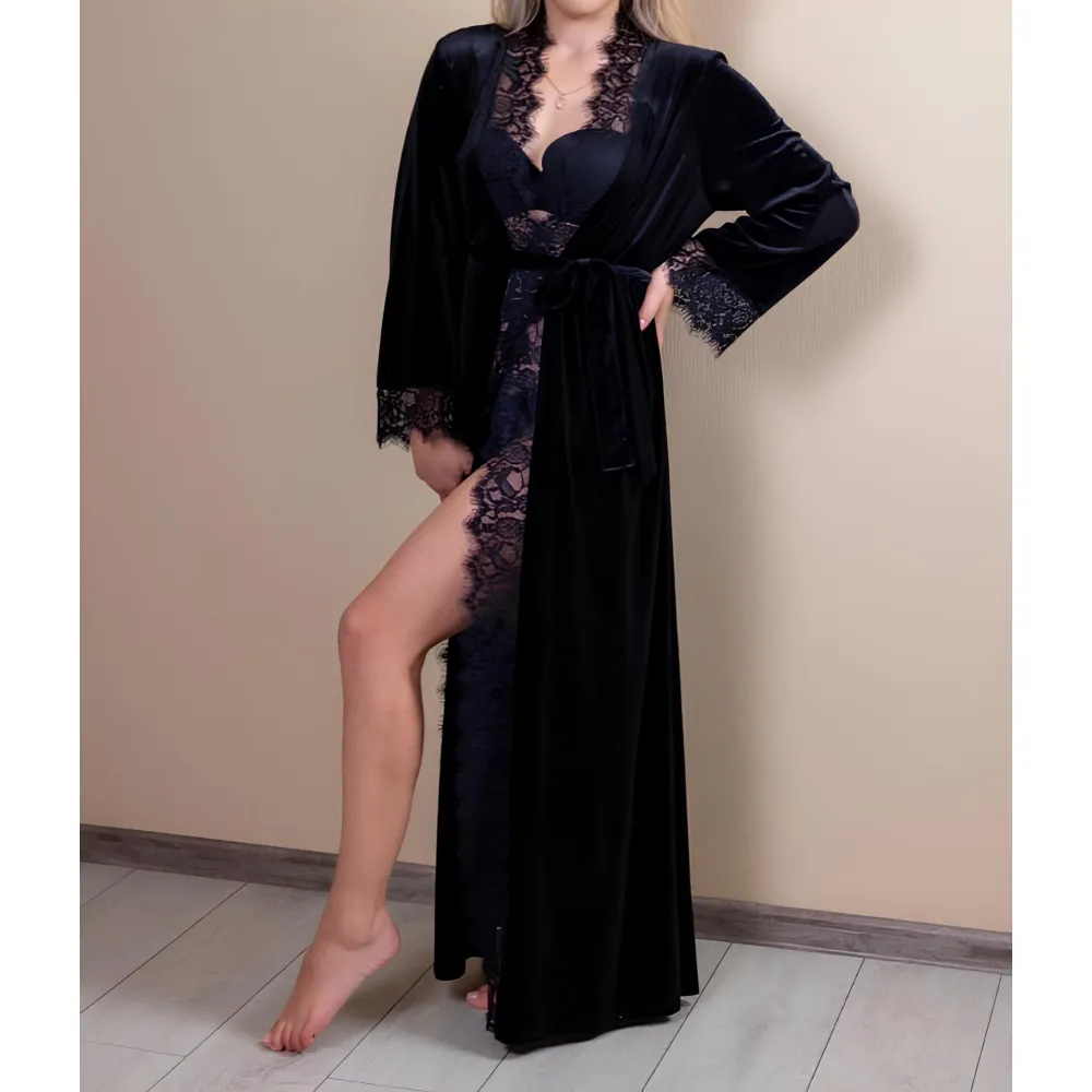 Halat de Dama din Catifea Finisat cu Dantela Neagra - MEI68