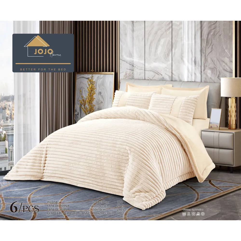 Lenjerie de Pat cu Pilota Inclusa , Cearceaf cu Elastic, 6 Piese, Blană de Iepure Artificială- JO860 Bej