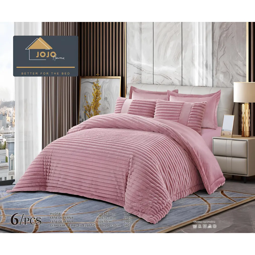 Lenjerie de Pat cu Pilota Inclusa , Cearceaf cu Elastic, 6 Piese, Blană de Iepure Artificială- JO862 Roz Pudra