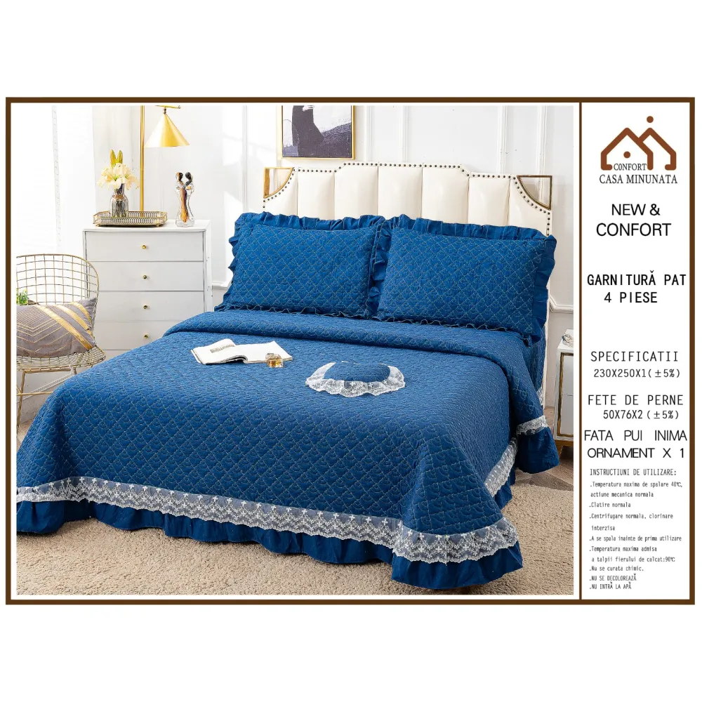 Set Cuvertura de Pat din Bumbac, 4 Piese, Albastru - PIT166