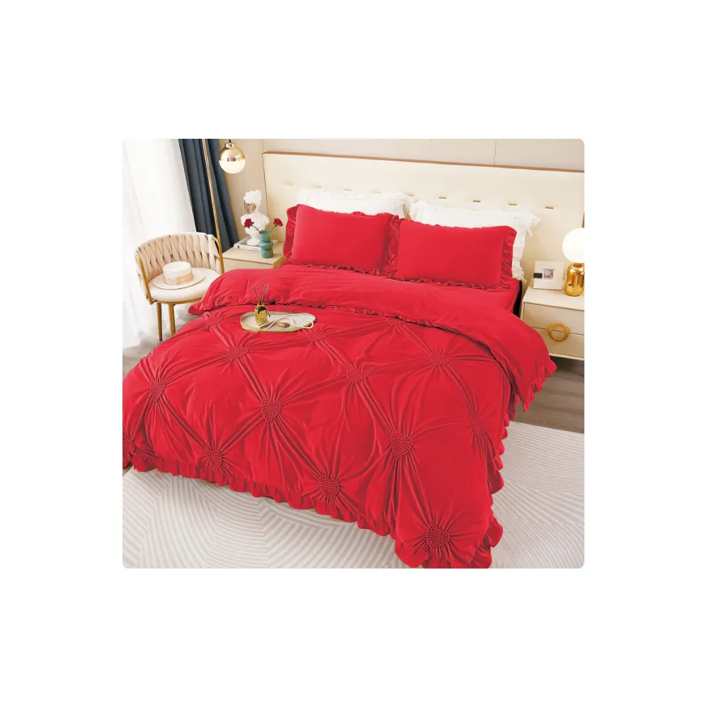 Lenjerie de Pat, 4 Piese din Catifea, cu Volanase, pentru Pat dublu, Rosu - FR157