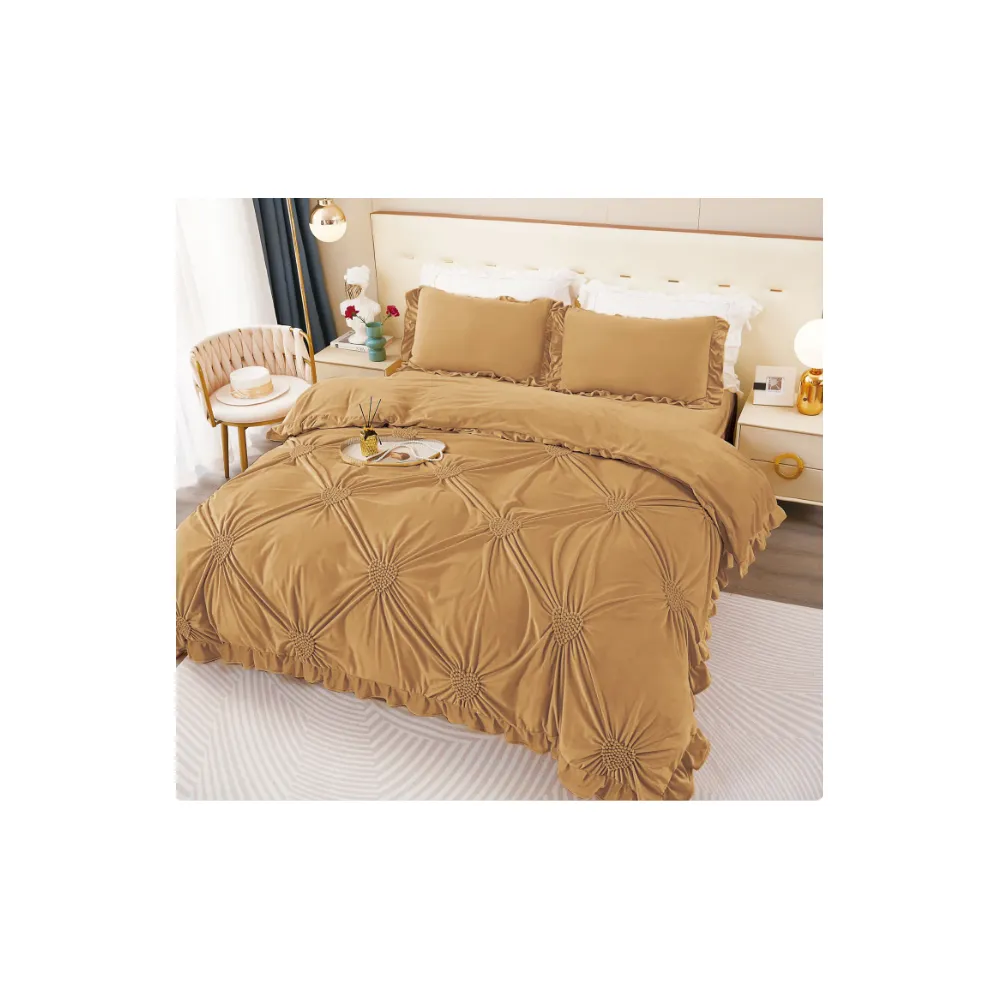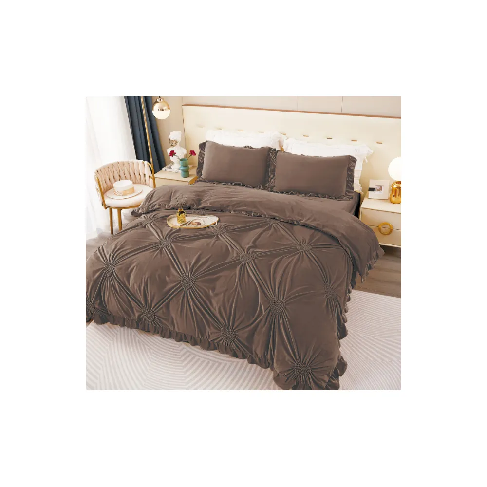 Lenjerie de Pat, 4 Piese din Catifea, cu Volanase pentru Pat dublu, Maro Deschis - FR149