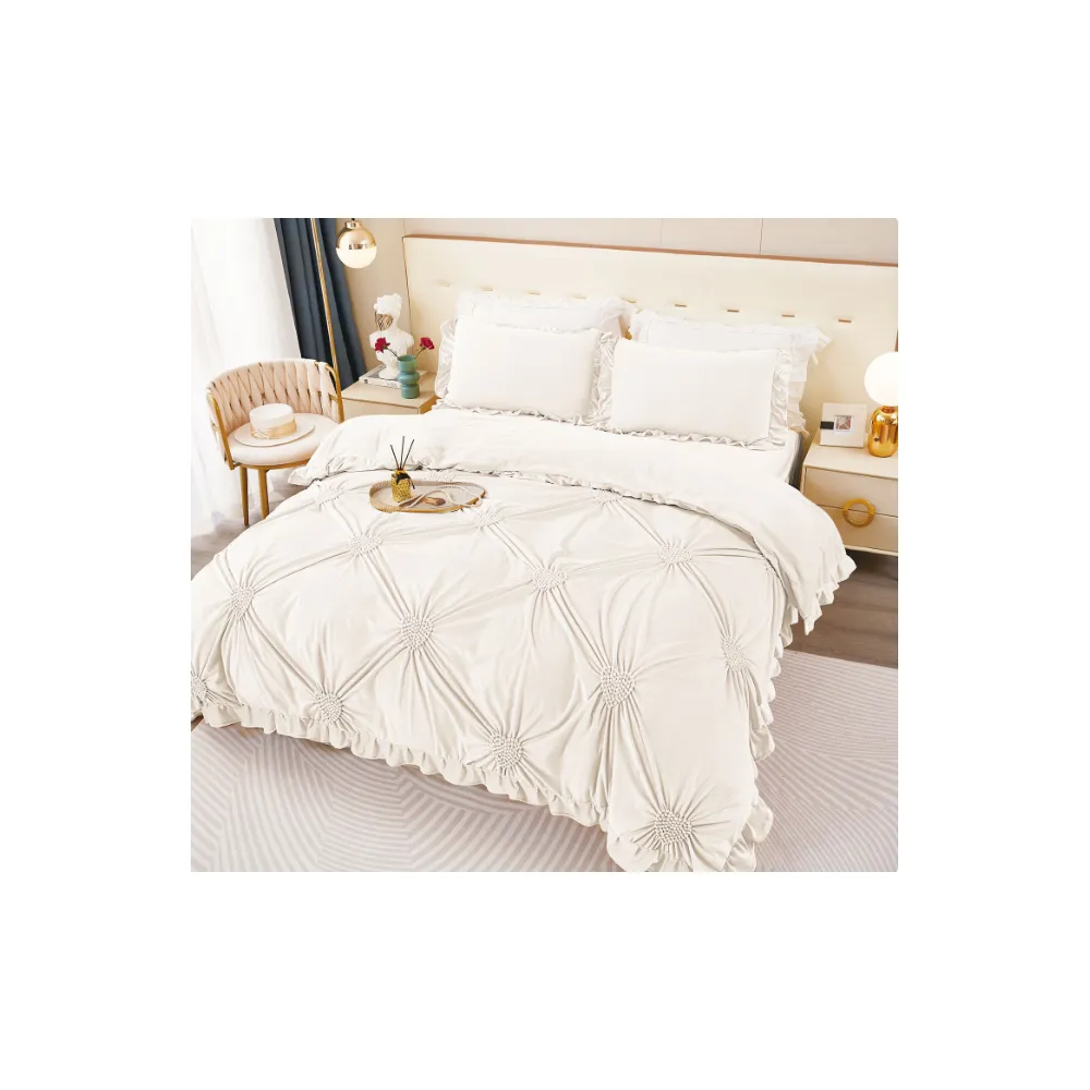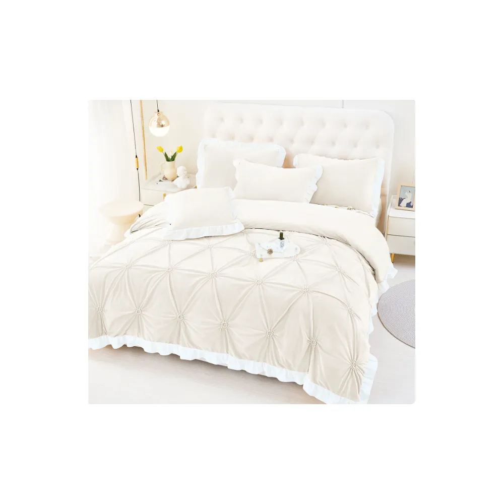 Lenjerie de Pat, 4 Piese din Catifea, cu Volanase, pentru Pat dublu, Cream Deschis - FR156