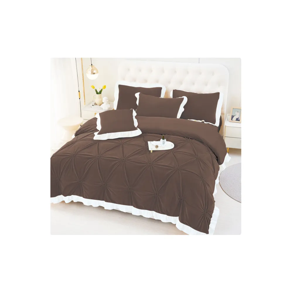 Lenjerie de Pat, 4 Piese din Catifea, cu Volanase, pentru Pat dublu, Maro - FR152