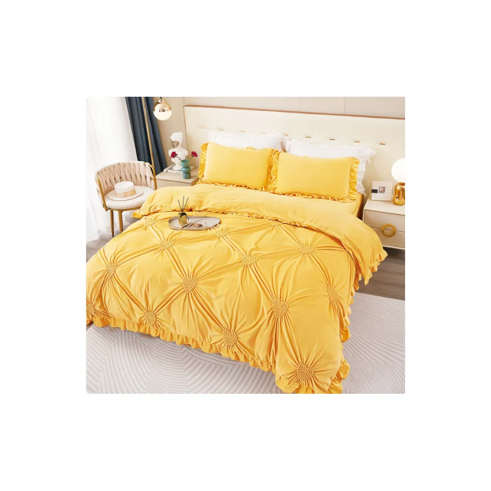 Lenjerie de Pat, 4 Piese din Catifea, cu Volanase, pentru Pat dublu, Galben - FR153