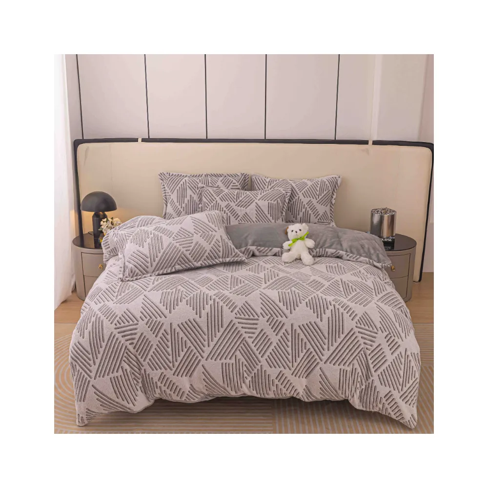 Lenjerie de Pat din Catifea, pentru Pat Dublu, 4 Piese, Gri cu Margine Alba - FR147