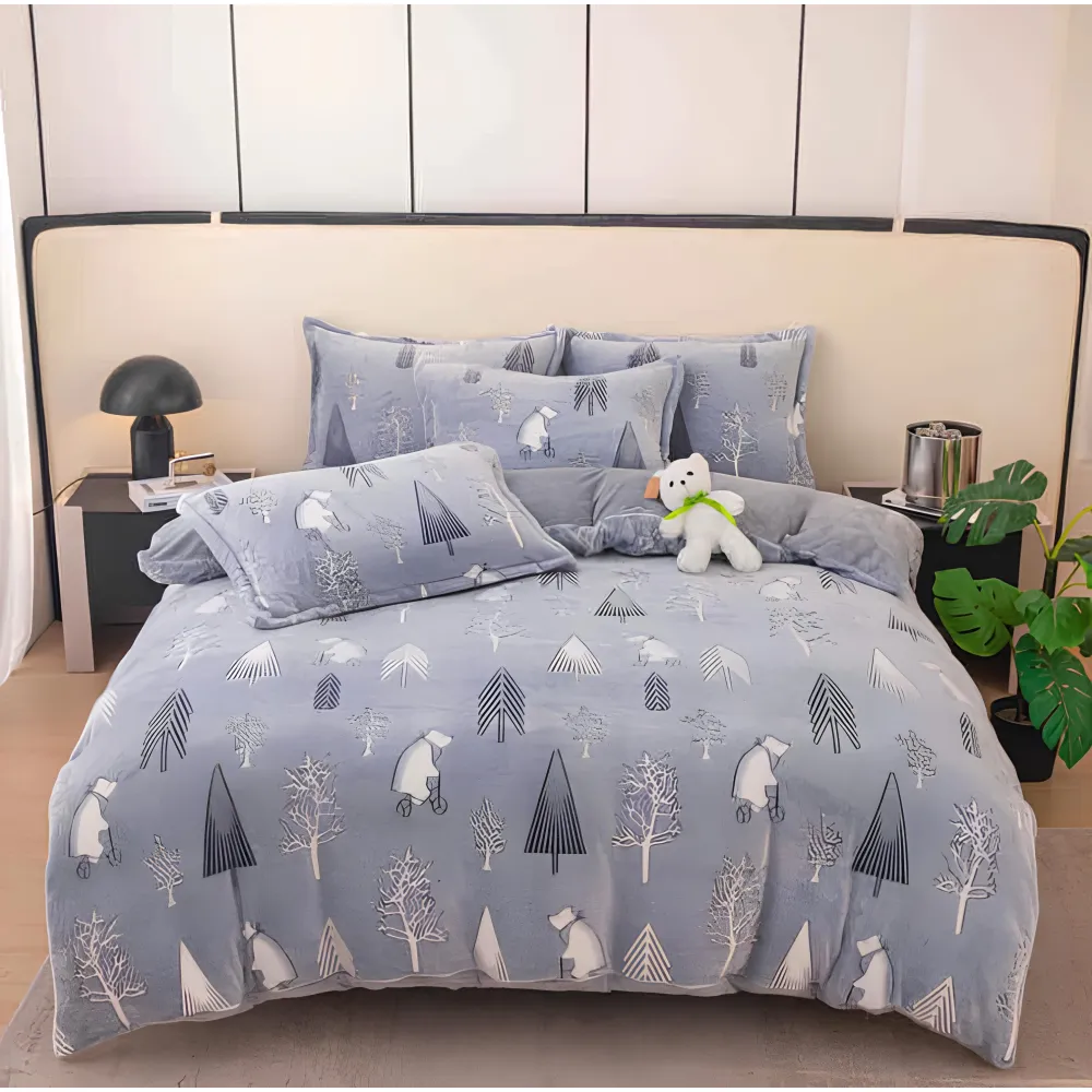 Lenjerie de Pat, 4 Piese din Catifea, cu Volanase, pentru Pat dublu, Gri Albastrui - FR150