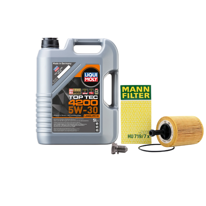 Set Ulei motor Liqui Moly Top Tec 4200 5W-30 5L + Filtru Ulei Mann Filter HU719 7X + Buson Golire Baie Ulei Oe N90813202