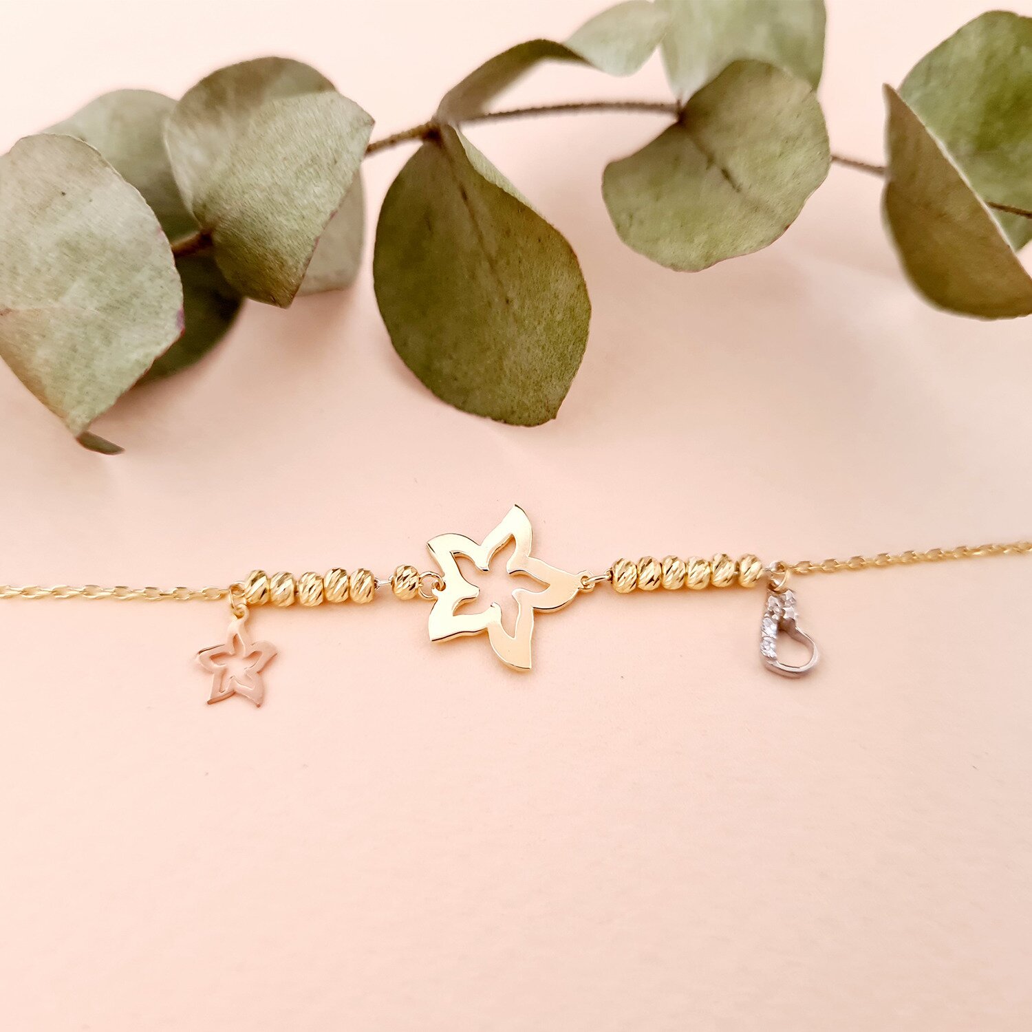 Bratara cu 6 bilute de 3 mm si charm coronita cu inima decupata - Aur Galben 14K - Snur reglabil
