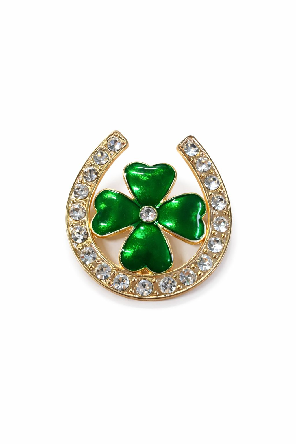 Brosa trifoi cu potcoava 4x4 cm, finisaj auriu cu pietre, simbol noroc cadou primavara