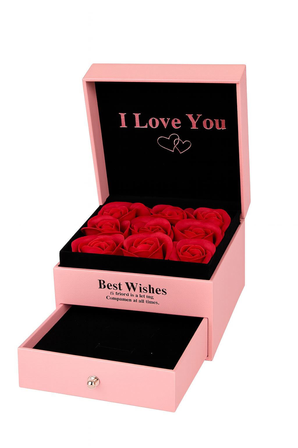 Cutie cadou cu 9 trandafiri de sapun rosii, model cu sertar, punga inclusa, 11x8 cm