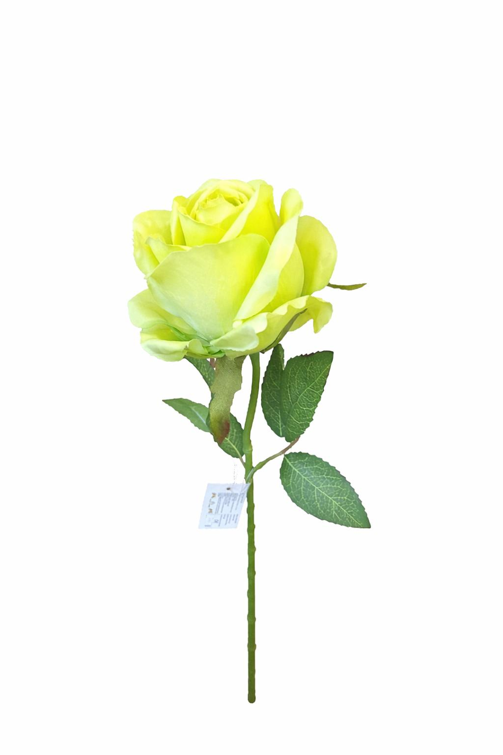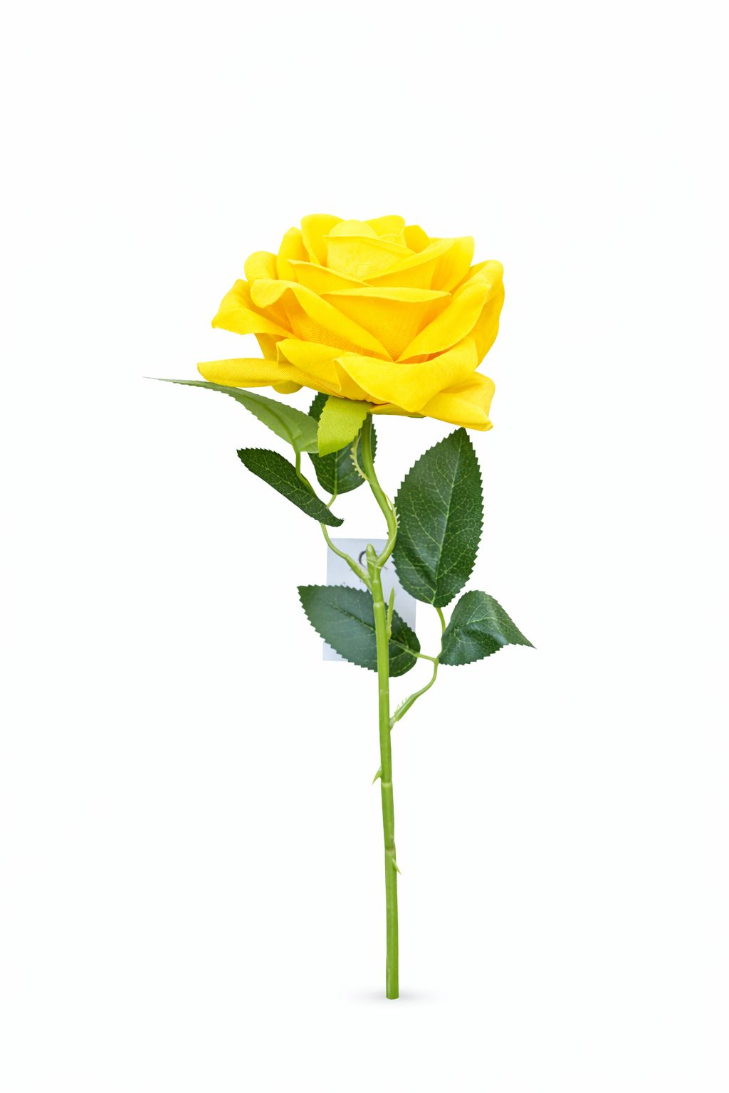 Trandafir artificial galben cu petale catifelate si frunze 46 cm calitate superioara