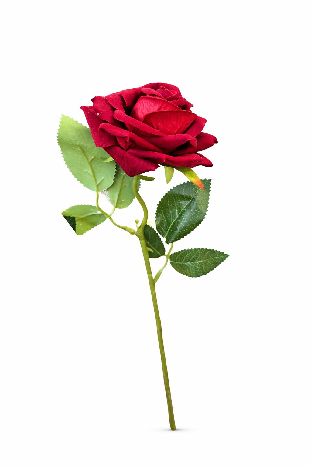 Trandafir artificial rosu cu petale catifelate si frunze 46 cm calitate superioara
