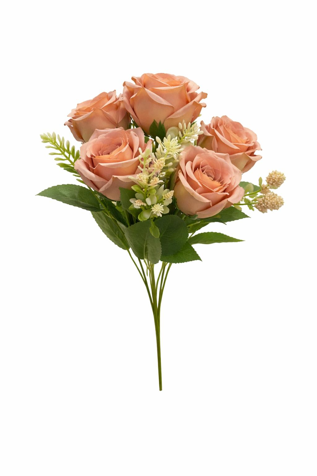 Buchet 5 trandafiri artificiali caramiziu cu frunze si boboci decorativi 30cm