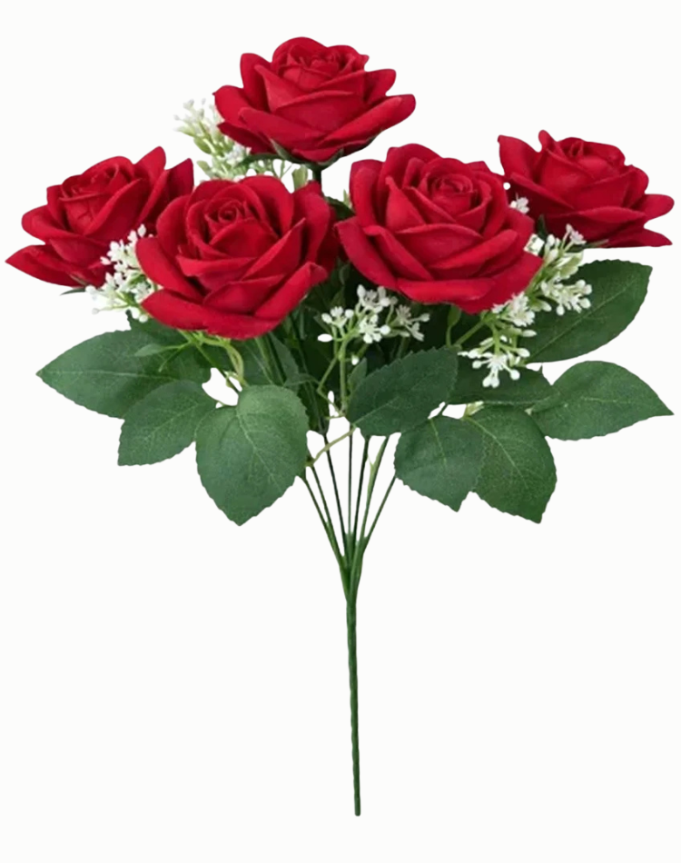 Buchet artificial deosebit cu 7 trandafiri catifelati rosu intens 30 cm